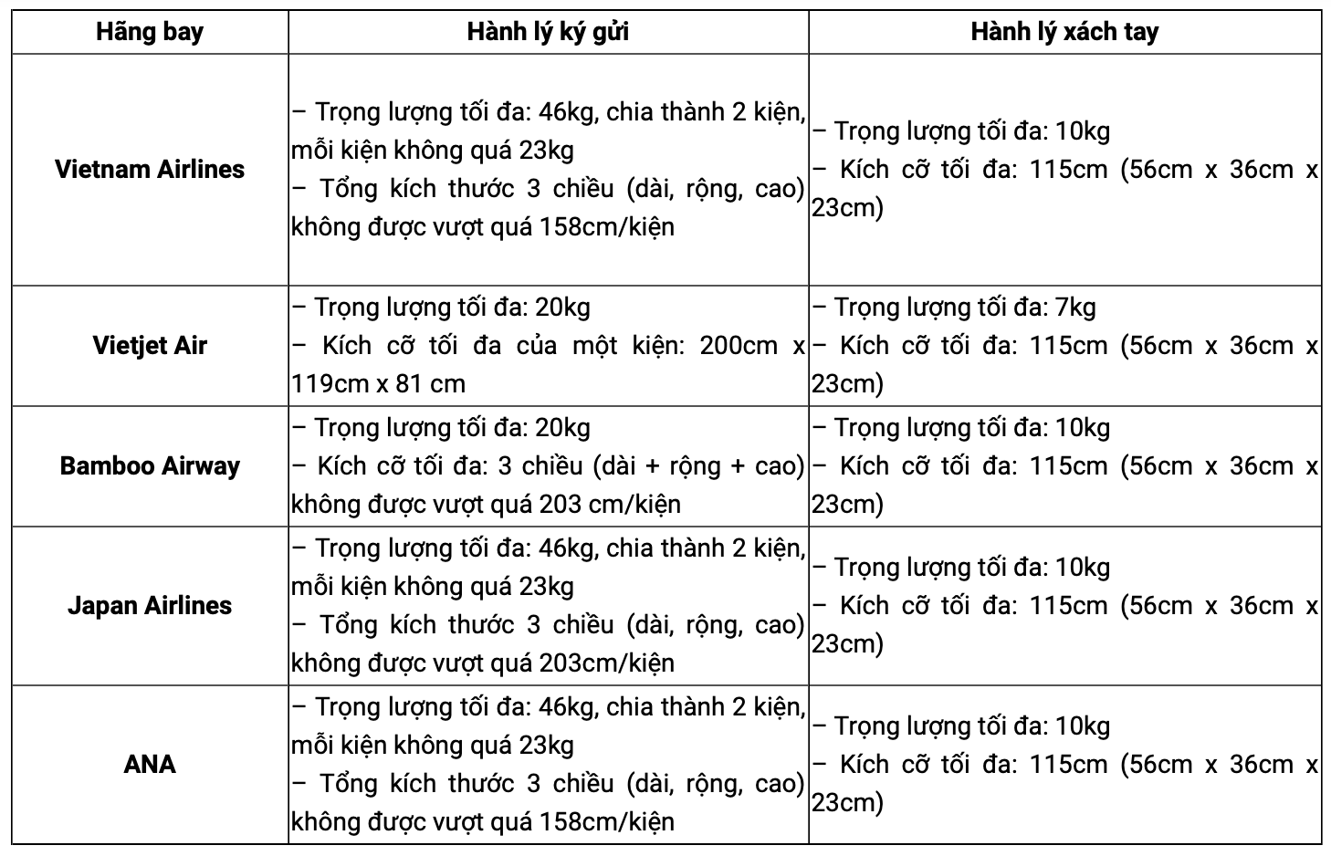 Quy định hành lý đi Nhật Hạng Phổ thông (hạng vé du học sinh thường lựa chọn) của một số hãng bay có khai thác đường bay từ Việt Nam đến Nhật: