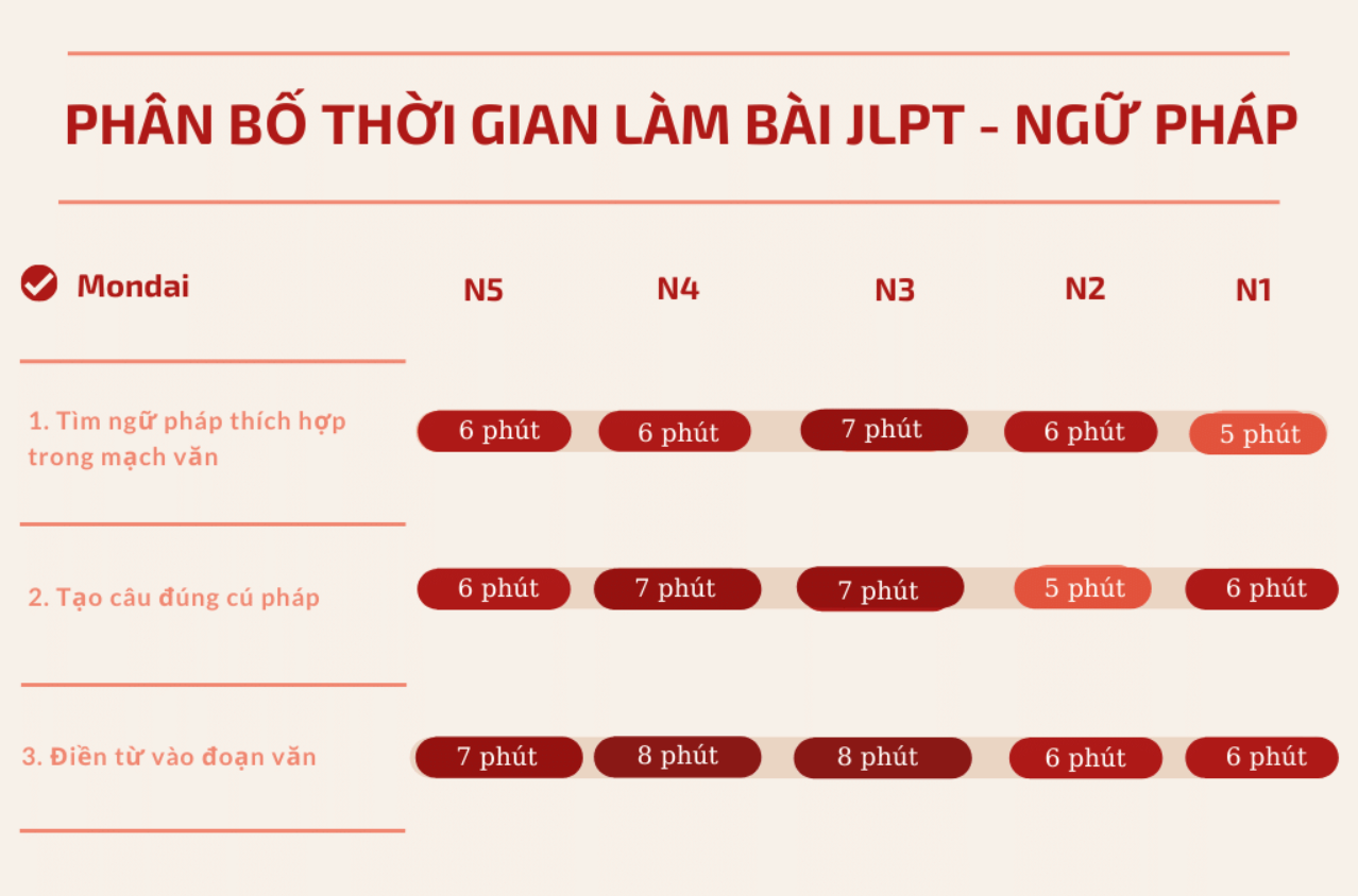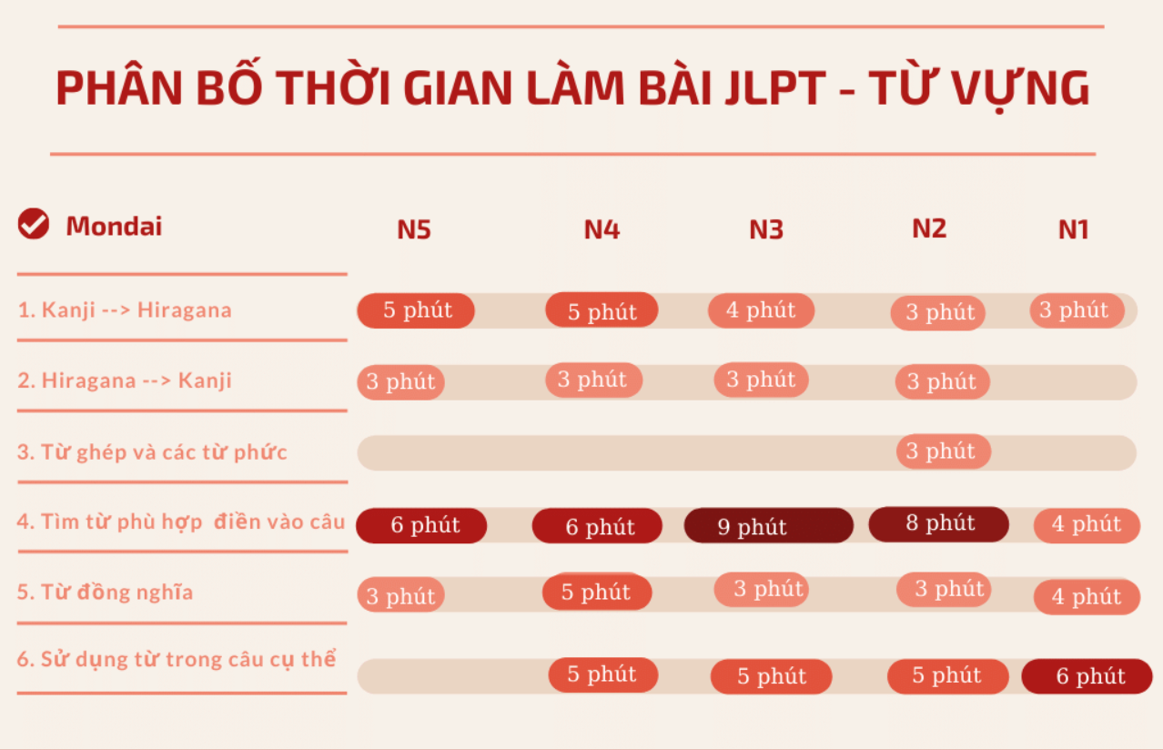 Bắt đầu từ năm 2020, JLPT đã thay đổi thời gian làm bài thi kỹ năng Từ vựng, Ngữ pháp - Đọc hiểu của N4 và N5, vậy nên đây sẽ là gợi ý phân bố thời gian mới nhất, cụ thể nhất cho từng trình độ: